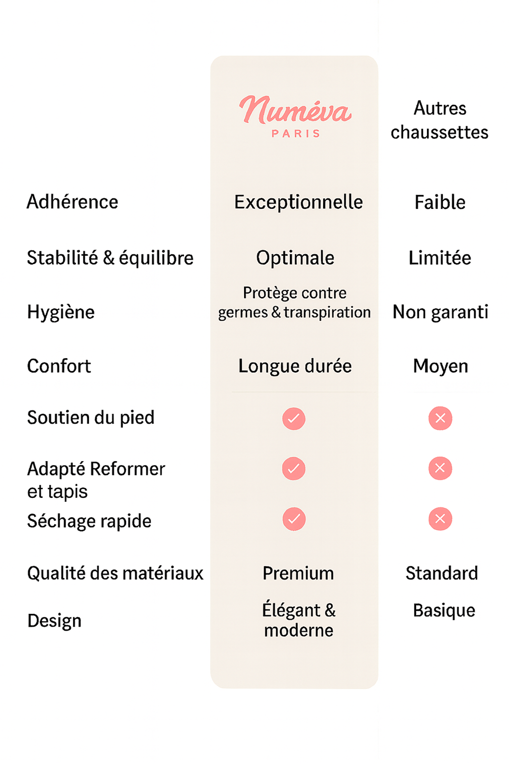 Numéva Paris réinvente les chaussettes de Pilates. Grâce à une adhérence exceptionnelle, une stabilité optimale et un confort longue durée, elles offrent maintien et hygiène à chaque séance, sur Reformer comme sur tapis. Conçues pour sublimer vos mouvements et vous donner une confiance absolue.